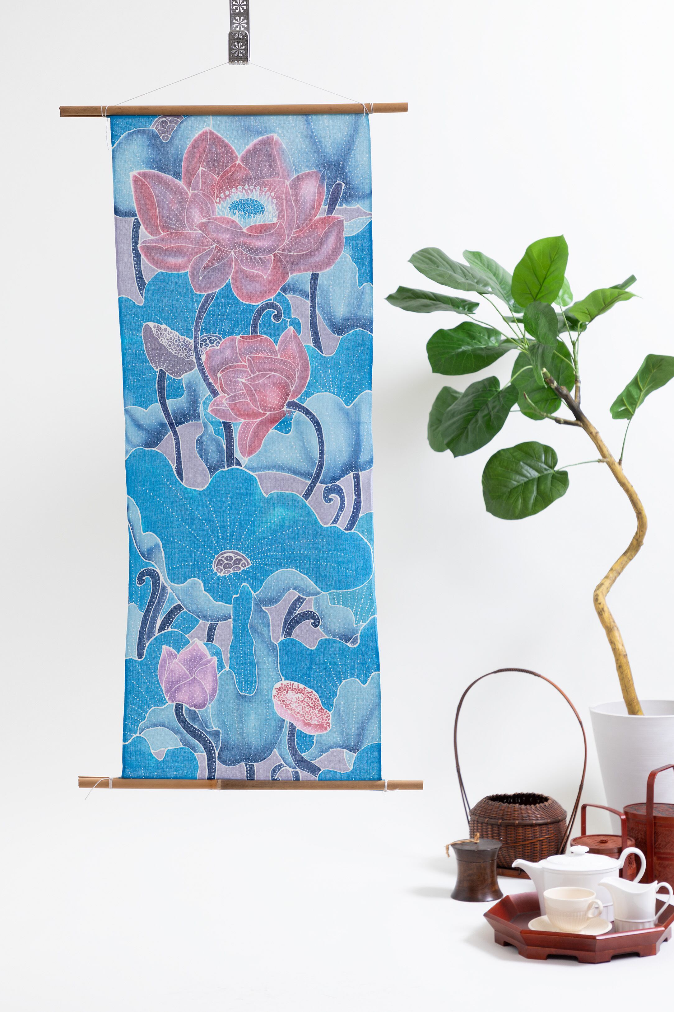 日本の晒しを使い 手描きインドネシアろうけつ染めで 和手ぬぐいとして「蓮」を表現しました。